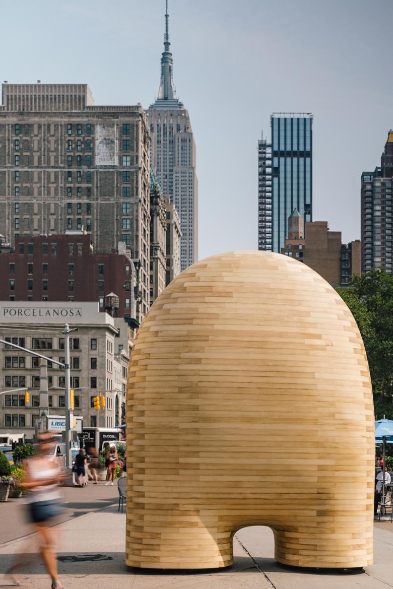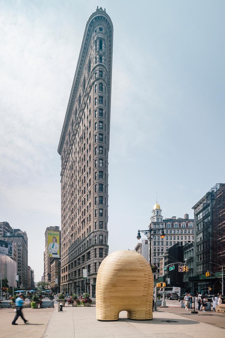 I stopped by after work yesterday to see Link in its context and touch the smooth wood surfaces. The press photos (above) give the impression that the sculpture stands out, calling attention to itself. But on my visit most people were more enthralled with the Flatiron looming overhead than its new neighbor standing across from it. Nevertheless, the choice of material – Accoya wood – is an interesting one that draws the sculpture toward the architectural. As mass timber continues to infiltrate architectural design, Link stands as an inadvertant link between art and architecture, a connection formed through wood technology.
