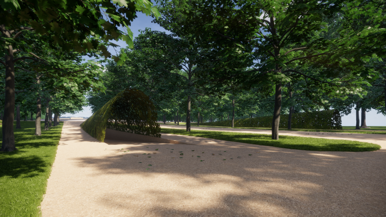 Visitors will be led underground through two tunnels that emerge from the old pathways and are aligned with the axis of the castle. The tunnels lead air from the new chamber into the three existing ones. Air will be pulled from the back end of the last chamber to each side, running up through two new air towers in the park.