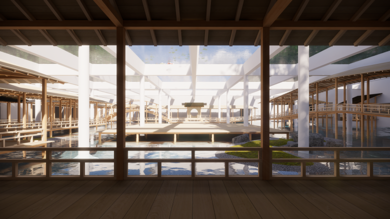 Covered walkways in The Fourth Chamber (Visualization © Sambuichi Architects)