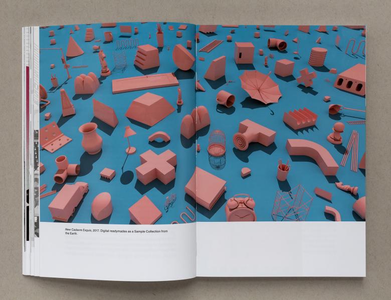 New Cadavre Exquis is a project from 2017 that took digital readymades (ducts, hinges, geometric forms, pipes, etc.) and reassembled them into building designs.