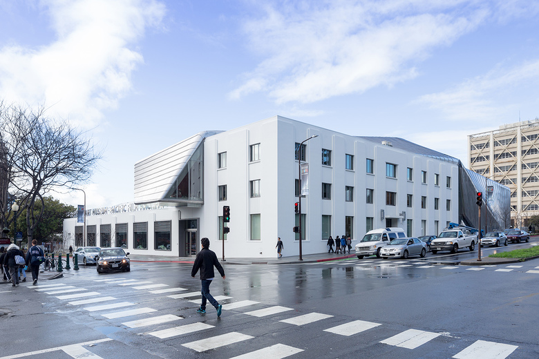 Oxford Street east elevation: The DS+R addition "peels away" to offer a peek inside the building through a glass storefront. (Photo by Iwan Baan. Courtesy of Diller Scofidio + Renfro, EHDD, and BAMPFA)