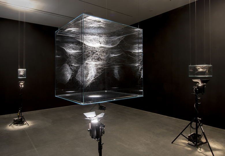 Architecture of Life, on view at the University of California, Berkeley Art Museum and Pacific Film Archive, January 31–May 29, 2016. Installation view of works by Tomás Saraceno. (Photo: Sibilia Savage)