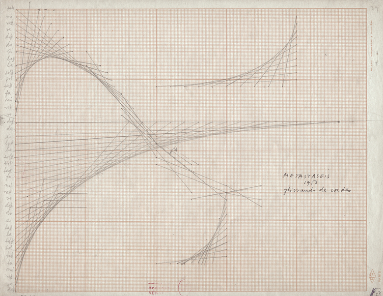 Iannis Xenakis: Graphic score for Metastasis, glissandi of chords, 1954; graphite on graph paper; 8 1⁄2 x 10 7⁄8 in. (Image: Courtesy of the Xenakis family, Paris)