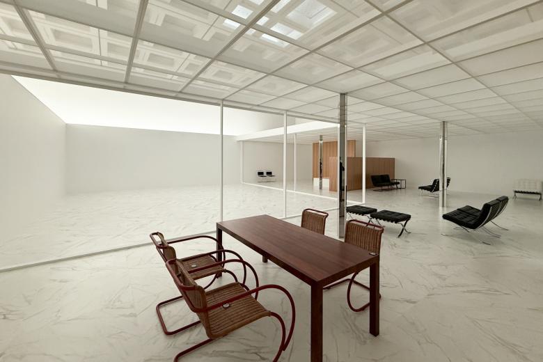 Soon after the Barcelona Pavilion (1929) and Tugendhat House (1930), Mies devised a series of courtyard houses that had similar free-flowing plans organized about walled-in courts. If built, they would have been grouped into higher-density urban assemblages, rather than as standalone houses in the landscape. None of the courtyard houses that Mies designed between 1931 and his emigration to the United States in 1938 were built, so they are not as well known today as the Edith Farnsworth House (1951) or even the unbuilt Resor House (1938). LIVING Modernity is the first attempt to take one of these projects, the Row House (1931), from drawing board to reality.
