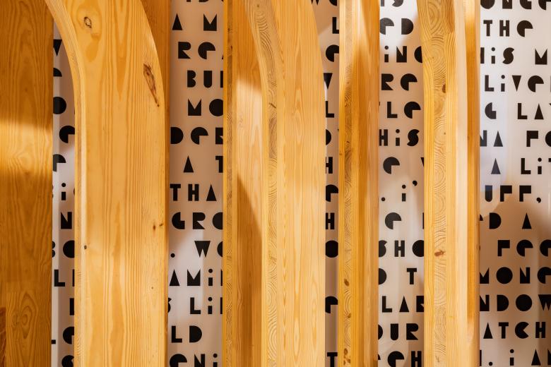 Approached from the museum's large atrium, visitors enter the exhibition through a portal with cross-laminated timber arches, as seen at top. Portland, Oregon's Plus And Greater Than, the exhibition's designer, layered the arches in front of wall graphics with the stylized font used for the exhibition title. (Photo: Elman Studio)
