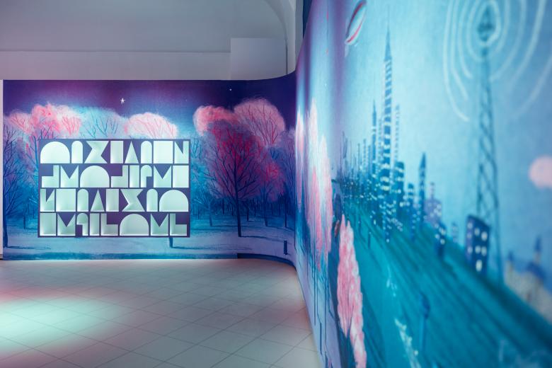 The landscape imagery wrapping the “Wider World” gallery is drawn from the books of author/illustrator Oliver Jeffers. (Illustration from What We’ll Build: Plans For Our Together Future by Oliver Jeffers, courtesy of Philomel Books)
