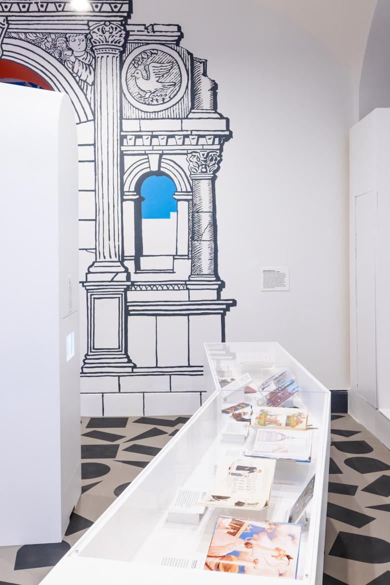 Children's books, preparatory artworks, and architectural models are displayed across a serrated wall in the “Building Readers” gallery. (Photo: Elman Studio)