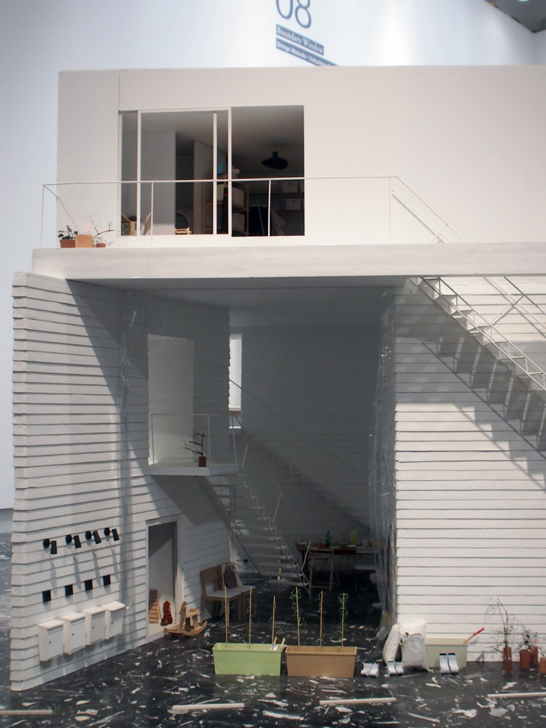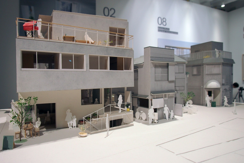 The pavilion, which received a special mention award at the opening of the Biennale, presents a dozen projects through models, drawings, photographs and films. Most appealing are the models, which range in scale from site models to large-scale construction details, with most falling in between, like large doll houses with furnishings provided. One notable example is the Yokohama Apartment by Osamu Nishida (On Design Partners) + Erika Nakagawa; the model sitting on the floor accentuates the semi-public courtyard that is found below the four apartments.