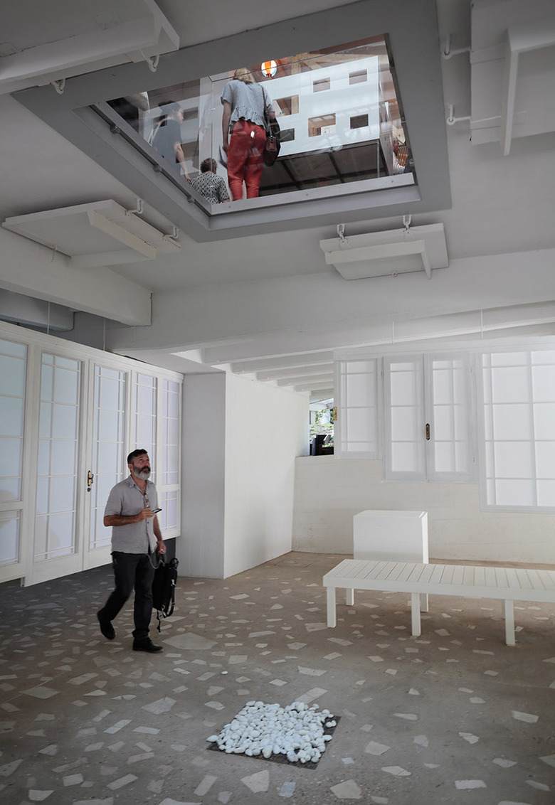 As described by the curator in the video at bottom, the term en comes from engawa, the outdoor space of a traditional Japanese house where the family would meet visitors. While the 12 projects on display in the pavilion illustrate contemporary reinterpretations of the engawa, interestingly the Japanese Pavilion (designed by Takamasa Yoshizaka and built in 1956) in the Giardini is an illustration of the same. An open space below the pavilion mediates between the outdoor space of the Giardini and the interior realm of the pavilion; an opening in the floor of the pavilion accentuates the relationship between these two spaces.