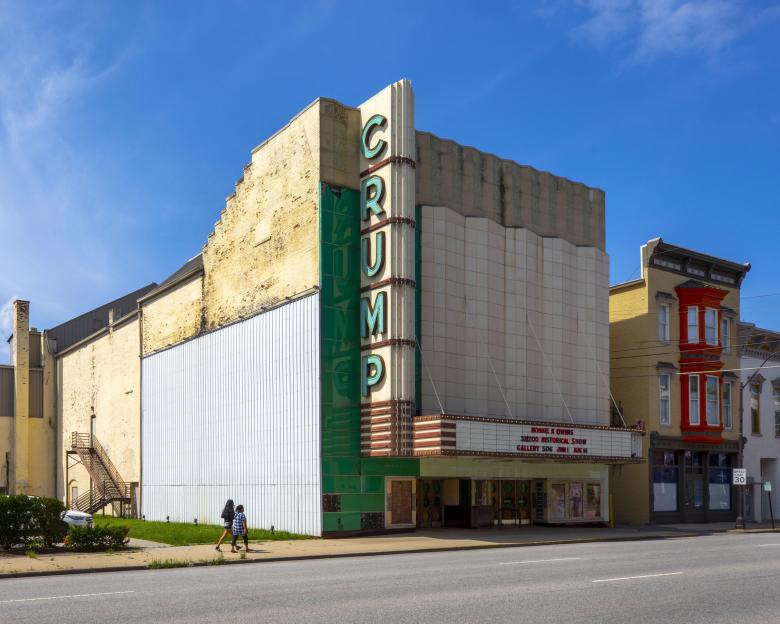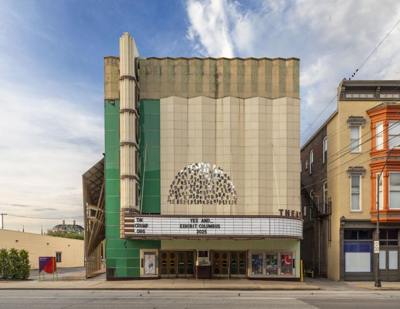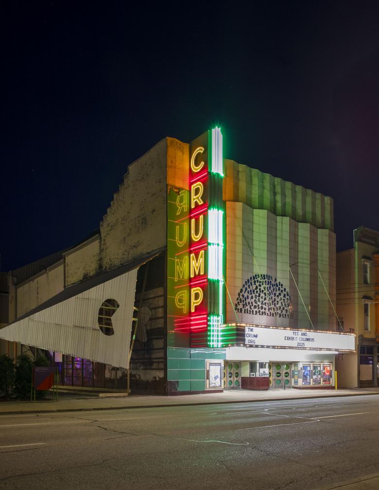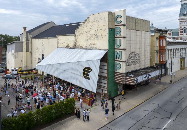 The Pac Man-like cutout in the siding is part of a rebrand, coinciding with the establishment of the nonprofit Crump Center for the Performing Arts, Inc. this year and the start of a larger transformation of the theater to its fully operational state. (Photo: Hadley Fruits for Landmarks Columbus Foundation)