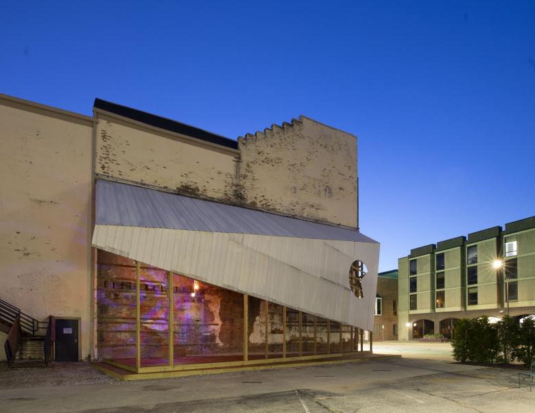 The empty lot east of The Crump arose from a fire in 1978. For this year's Exhibit Columbus, the space has been enlivened by Charlie Vinz and Adaptive Operations through a platform covered in metal siding. (Photo: Hadley Fruits for Landmarks Columbus Foundation)