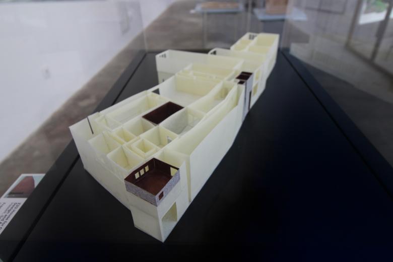 The extension melds with the existing to create a labyrinth of spaces behind a primarily blank brick wall facing the street and a rear facade with windows looking on to a generous courtyard; the model captures the series of rooms and quiet nature of the architecture.