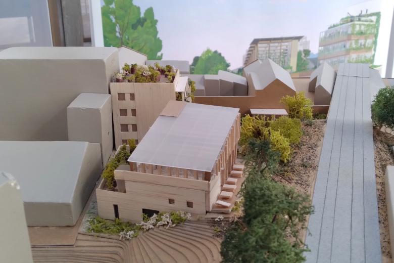 The model of the facade and front section of the Town House, as in the top photo, emphasizes the unique program, the accessible nature of the project, as well as the literal nature that is along the sidewalk and will cover parts of the facade.