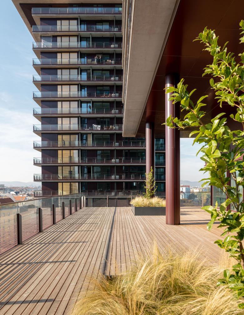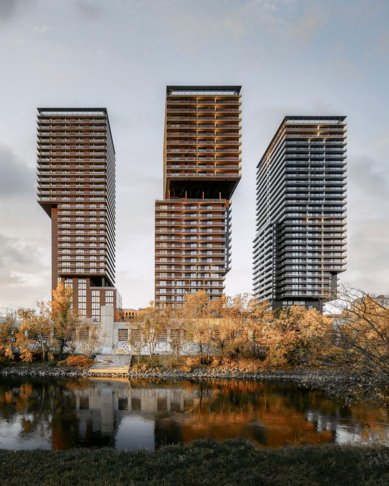 "Located in Vienna’s 3rd district, directly on the Danube Canal, the high-rise ensemble consists of three residential towers in dialog with each other. The towers are connected by a two-story podium that links the TownTown Business Park with the Danube Canal. The podium contains a wide range of communal areas, restaurants, stores, and a kindergarten, benefiting both residents and neighbors."