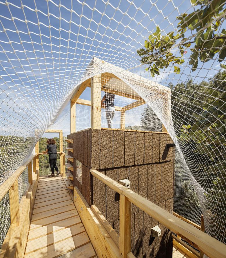 Students in IAAC's Master in Advanced Ecological Buildings and Biocities (MAEBB) postgraduate program carry out their design, research, and building efforts at Valldaura Labs in the mountainous Collserola forest. In the case of FLORA, that setting pointed to the program of the building — a research station for observing the biodiversity of the forest canopy and the impact of climate change upon it — as well its construction: It is made primarily from invasive pine trees that were selectively removed from the forest. Covered in a stretched netting that recalls the work of SO–IL, the wood structure will eventually be shrouded by plants, allowing the researchers inhabiting it to better observe the surrounding habitat unobtrusively. Take a visual tour through FLORA below, with further information on the project provided in the captions.