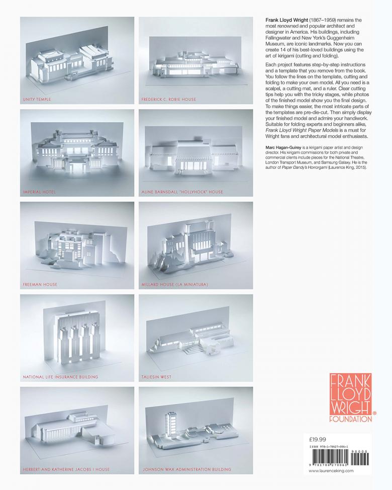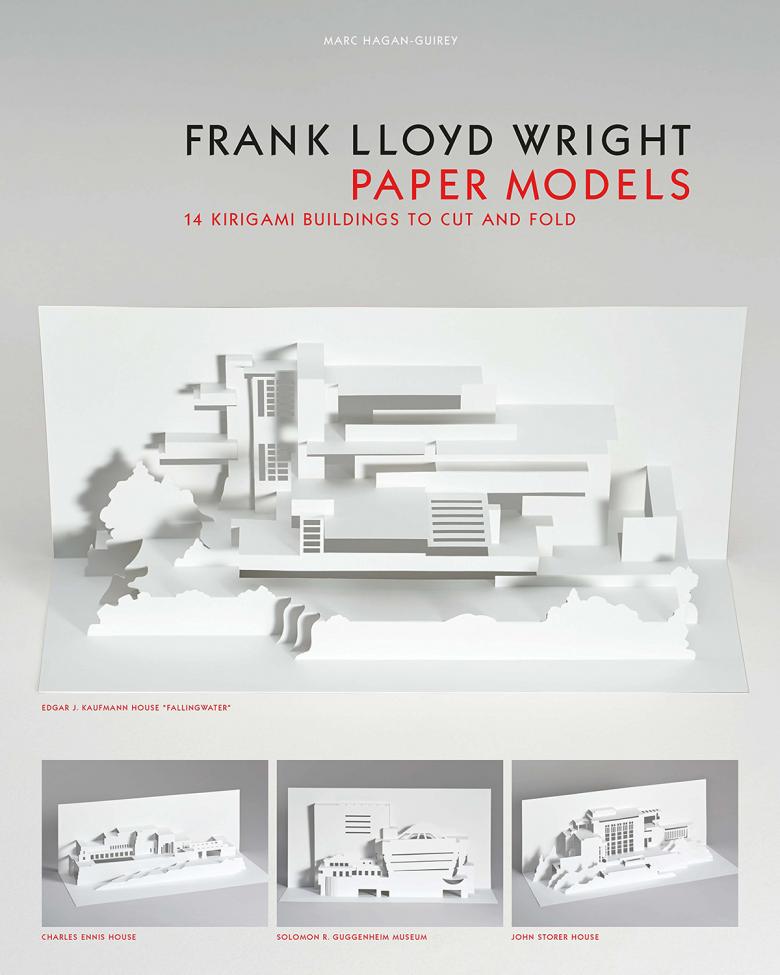 Marc Hagan-Guirey, a kirigami paper artist, has collected fourteen Wright buildings in Frank Lloyd Wright Paper Models, published next month by Laurence King. Unlike origami, which is limited to folding, kirigami also includes cuts to the sheet of paper. The book comes with instructions on the technique, some background on each building, and drawings of them on 135 lb (200 gsm) stock, just the right weight for cutting and folding. The sheets come with some cuts, such as windows, already done, but there are lots of cuts and folds to be done. In other words, this is not a book with readymade models; it requires a good deal of work – and patience – on the part of the reader/model maker.