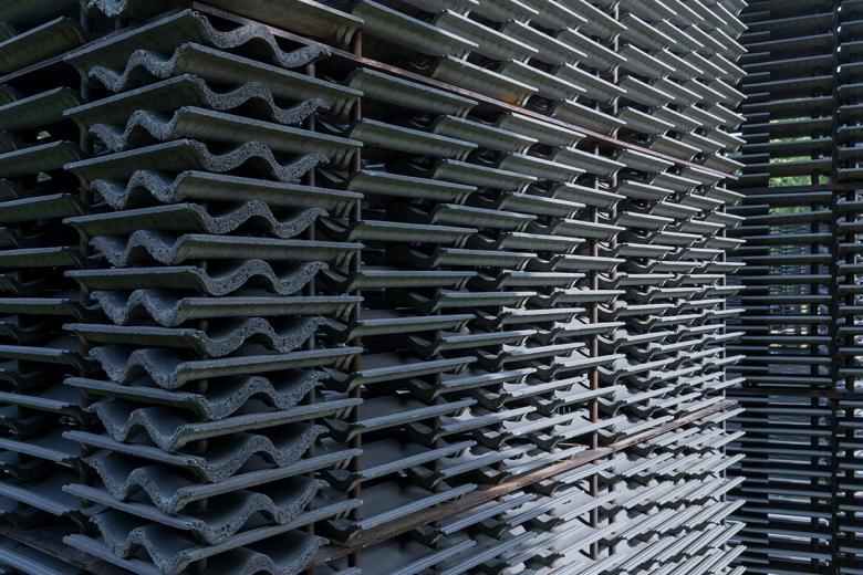 Escobedo, whose selection was announced in February, created a walled courtyard with a shallow pool at its center. The walls are porous, much like the traditional celosias (breeze walls) common in Mexican architecture. They are built from British-made cement roof tiles in a staggered pattern that gives the walls an apparent vertical striping. The photos by Iwan Baan capture this but also the curved profiles of the roof tiles and the mirrored roof plane in the courtyard that combines with the shallow, walkable pool to reflect the architecture and its surroundings. Escobedo describes her pavilion as "a timepiece that charts the passage of the day," while the Serpentine Galleries attests it will enable visitors to "feel a heightened awareness of time spent in play, improvisation and contemplation over the summer months."