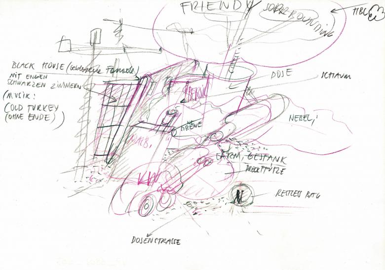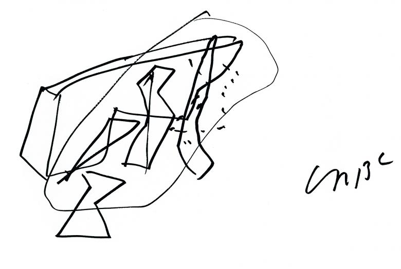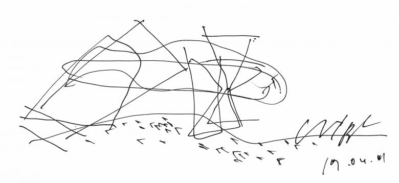 With its chronological presentation of more than 1,000 sketches for 263 projects, all of them culled from Prix's more voluminous and professionally organized digital archive, the book is a depiction of Coop Himmelb(l)au's arc over more than fifty years. Readers see early actionist performances like Hard Space (1970) and The Blazing Wing (1980) giving way to exhibitions, sculptures, and installations and then eventually to actual buildings. The first of the studio's buildings, the Rooftop Remodeling Falkestrasse (1983–1988) — boastfully billed as "the first built Deconstructivist building in the world" by Prix — still enthralls four decades later. Readers not familiar with these and other Coop Himmelb(l)au projects are aided by small photographs of the realized buildings and models of the unbuilt ones; without them even this writer would have a hard time deciphering some of Prix's more "sketchy" sketches.