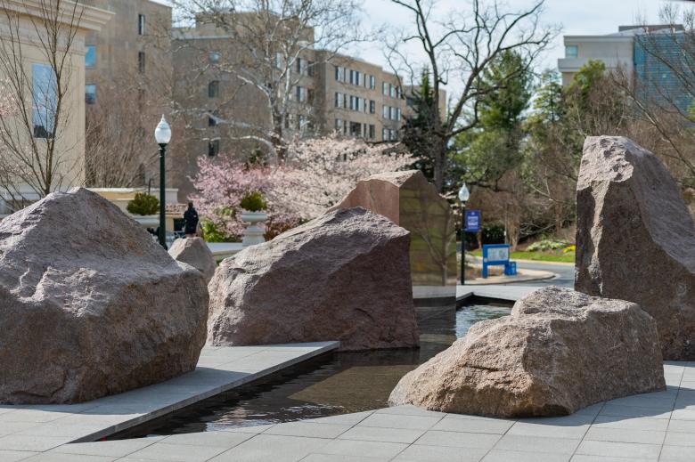 The installation — five large boulders placed astride a 60-foot-long trapezoidal pool — was notable for being the first major commission for Zimmerman, who earned her MFA at UCLA in 1974, gained the commission in 1981, and saw it completed in 1984. Furthermore, Jack Rasmussen, director and curator of the American University Museum at the Katzen Arts Center, across from which Sudama is located, described the original as “a major, ambitious installation. Women artists just didn’t get commissions like this at that time.”