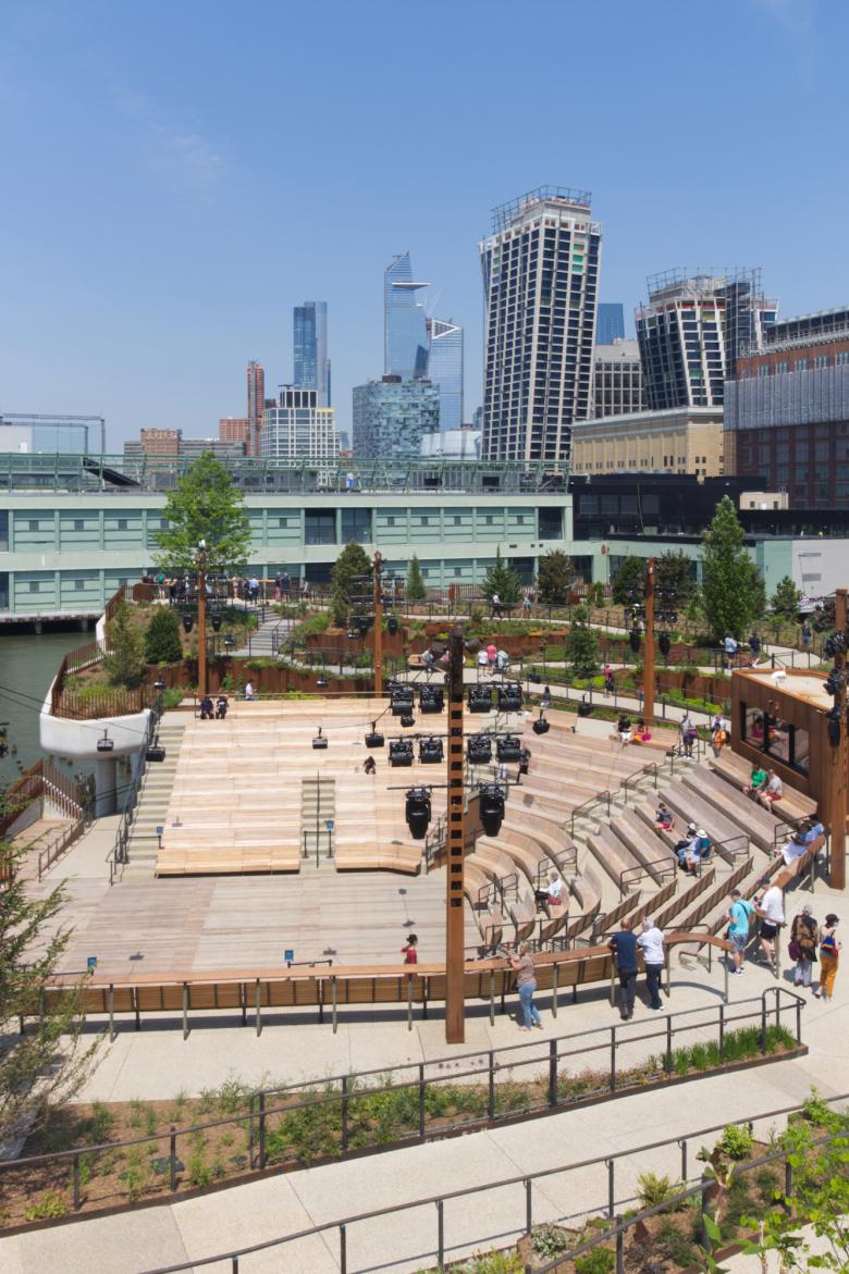 The view from atop the tallest overlook reveals the west-facing 687-seat amphitheater — "The Amph" — along the western edge of Little Island. Pier 57 can be seen beyond, while towers next to the High Line and at Hudson Yards loom beyond. (Photo: John Hill/World-Architects)