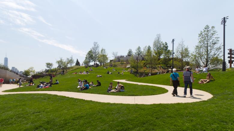 Between the overlook and the main plaza, currently home to food vendors and seating, is a lawn and meandering path that provides an accessible route to the overlook. (Photo: John Hill/World-Architects)