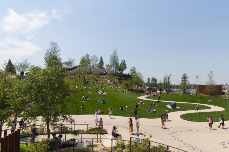 The tiered lawn was a popular spot on opening day and will most likely remain so through the warm summer months, as people long cooped up during the pandemic yearn to be outside free of mask mandates. (Photo: John Hill/World-Architects)