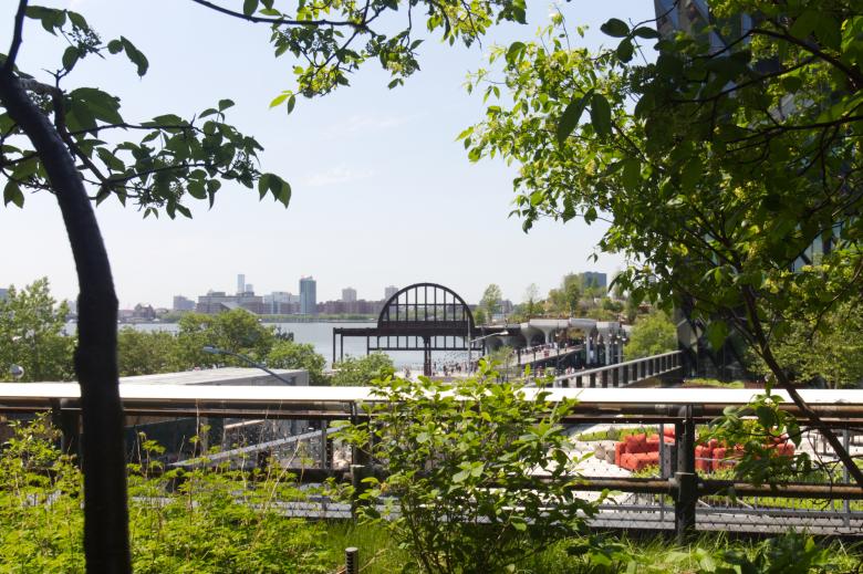 Little Island as seen from the High Line south of 14th Street: The steel arch is all that remains from Pier 54. (Photo: John Hill/World-Architects)