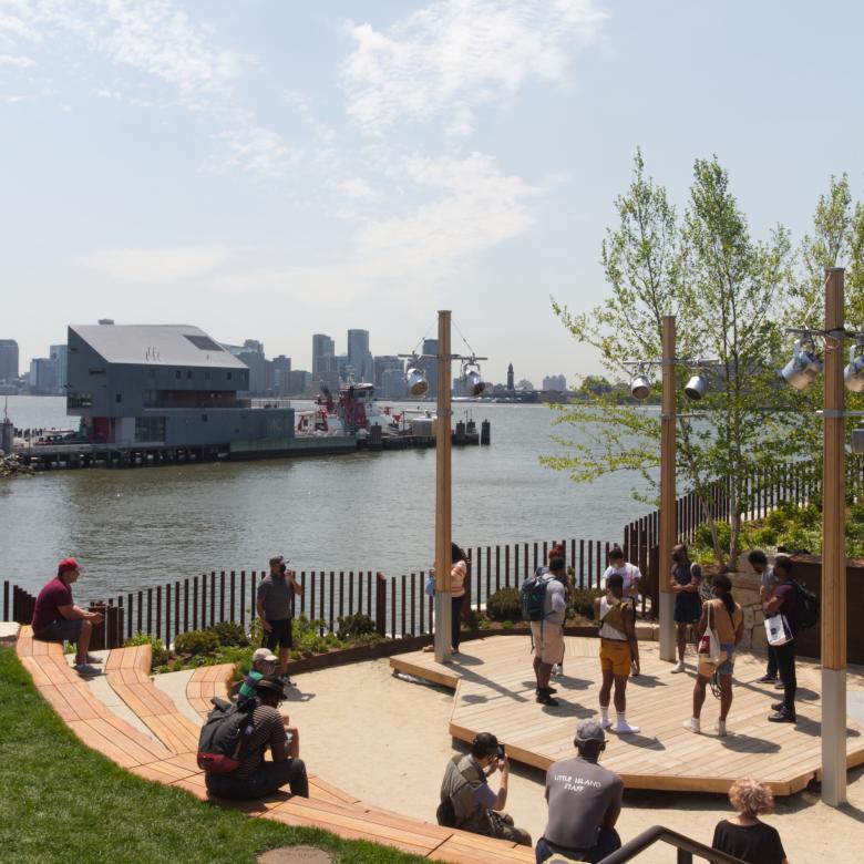 A small performance space sits in the low point along the south edge of Little Island (the dip seen earlier), overlooking FDNY's Marine Company 1 at Pier 53, at the tip of Gansevoort Peninsula. (Photo: John Hill/World-Architects)