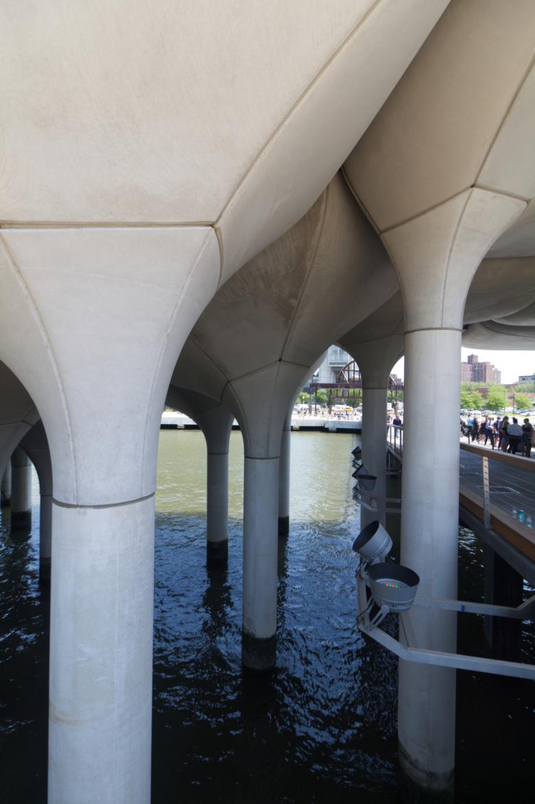 Little Island is supported by 132 "tulip" columns in concrete, their different heights resulting in an undulating topography. The wood pilings from Pier 54 are visible just barely poking above the surface of the water. (Photo: John Hill/World-Architects)