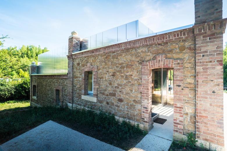 Haus Gonner in Rumelange was built around 1900, as the office building for ARBED for the local iron ore mine. Its brick architecture bears witness to the history industrial buildings. It was renovated by heisbourg strotz architects, who divided the floor plan into four cabins with two beds on each of the two floors, plus a kitchen and dining room. The bedrooms have one double bed and a closet, a shower, and a separate toilet. People can book the whole house or just individual rooms. The roof and a dividing wall were removed. The timber frame of the new construction was assembled on the adjacent car park, and in one morning this new building was inserted into the old building by means of a mobile crane. Work then was reduced to technical installations as well as carpentry and furniture. Inside, the finishings are minimal, leaving the spruce surfaces visible. A relief designed by the artists Feipel and Bechameil was placed on the doors. The roof and window frames were covered with anodized aluminum panels that contrast with the matte brick facades.