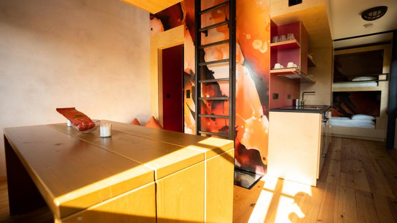 In the former administrative building house in Tetange, trolley cars full of ore were weighed before being sent to the steel plants in the region. As renovated by Tetra Kayser Associés, it is a cabin with six beds, including a second-floor bed alcove reached by a ladder. Street-art frescoes by Daniel Mac Lloyd give the interiors an industrial touch.