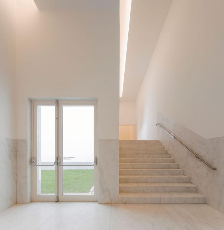 The new wing's reinforced concrete walls, finished with painted plaster flush with granite wainscoting, closely matches the 1999 building by Siza. (Photo © Fernando Guerra)