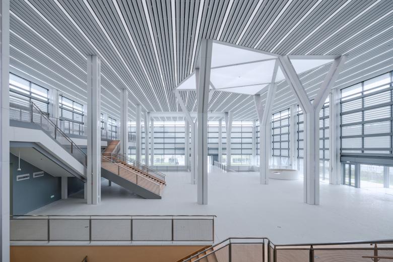 At the Adolescent Activity Center and Civic Art Center in Shanghai’s Pudong district, the staggered open levels create airy shaded places of encounter. While the building itself is huge, the arrangement of smaller huts and boxes underneath and beyond the roof overhangs give the project its human scale. The open-air hallways make the building permeable, giving the architectural design a reasonable and attractive twist that is adapted to the local climate.