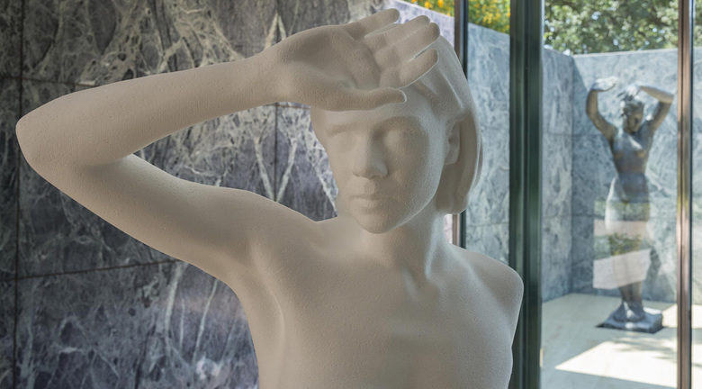 Xavier Veilhan. Architectones Barcelona Pavilion will close on August 31 after its two-month run at Mies van der Rohe Pavilion. In his seventh and final Architectones exhibition, Parisian artist Veilhan has placed sculptures of the nude figure Aina in different sizes and materials (wood, foam, metal) throughout, linked by a wood walkway that cuts diagonally through the pavilion from the basin with Georg Kolbe's Alba statue to the middle of the outdoor pool. Previous Architectones pieces occupied VDL House by Richard Neutra's VDL House in Los Angeles, Konstantin Melnikov's eponymous house in Moscow, and Le Corbusier's Unité d'Habitation, among other modern masterpieces.