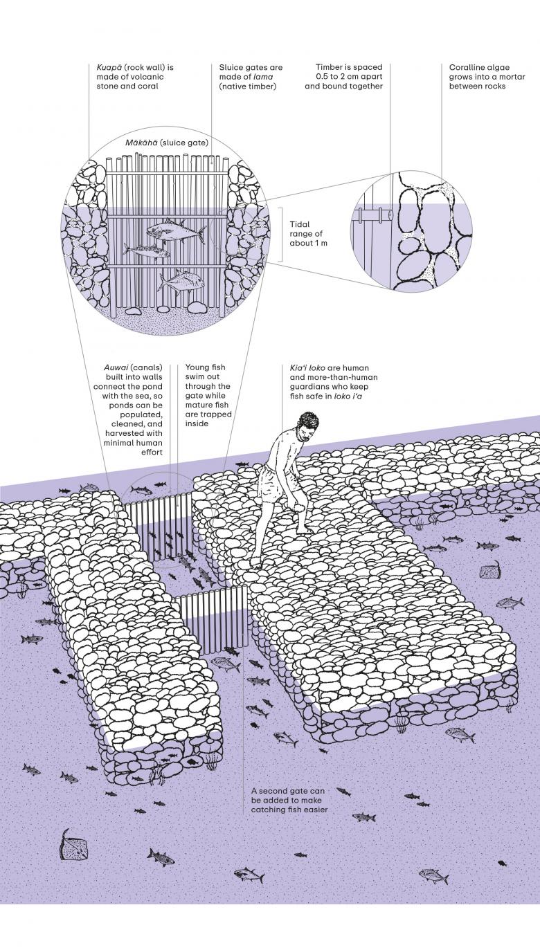 Another illustration by Müller (below) describes how the Loko i‘a Fishponds of the Native Hawaiians are built and work. Also visible in the photograph at the top of this article, some varieties of the coastal, brackish-water fishponds have been made using volcanic stones carried down to the shore, incorporating sluice gates that allow young fish to move freely back and forth, between ocean and pond, while mature fish are trapped inside. Like much of Lo—TEK Water, in addition to detailing the construction and function of the hydro-based TEKnologies, Watson and her collaborators describe the spiritual connections humans have had with water—connections that allowed nature to thrive over the course of centuries but were destroyed or threatened with colonization.