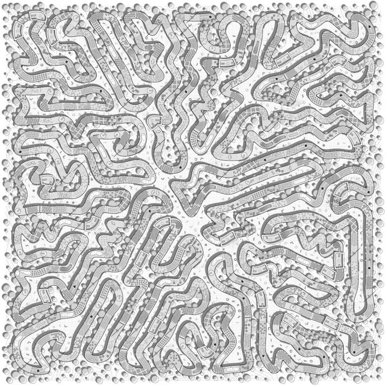 One of the last images in the book is “The Walled City (10-Mile Version)” by Andrew Kudless / Matsys, which depicts a snaking roofscape created by an automated process; underlying it is a rejection of Donald Trump's border-wall policy ca. 2016.
