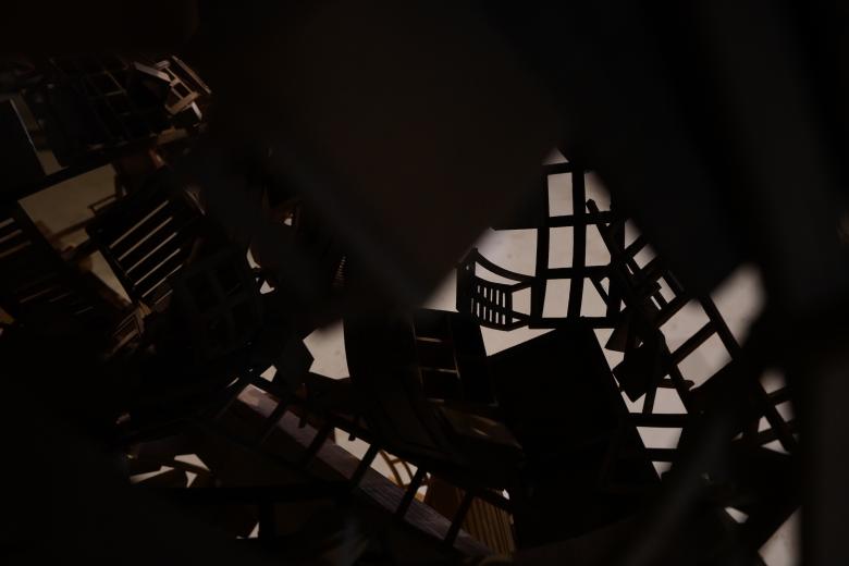 Just as the sculptures don't touch the walls of the rooms, the individual elements of Cloud and Could Burst have gaps, holes and overlaps, leading to some appealing shadow play — another way the artworks interact with the historical rooms. (Photo: Anubhav Syal, courtesy of Saat Saath Arts Foundation)
