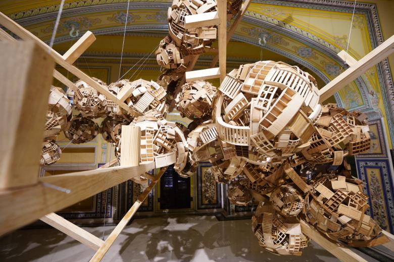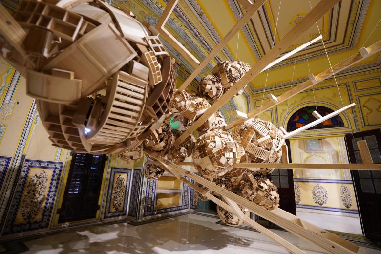 The second piece, Cloud Burst, is more aggressive, with ladder-like pieces of lumber appearing to burst forth from the molecular forms. (Photo: Anubhav Syal, courtesy of Saat Saath Arts Foundation)