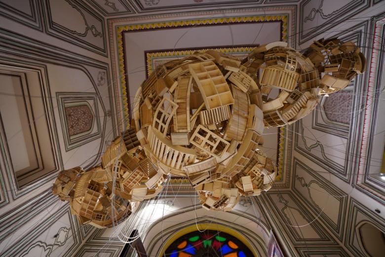 Up close, the spherical, molecular forms of the sculptures are clearly comprised of miniature objects, such as doors, windows, ladders, bookcases and the like. (Photo: Anubhav Syal, courtesy of Saat Saath Arts Foundation)