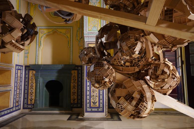 Created by Maharaja Sawai Madho Singh, the founder of Jaipur, in the late 1800s, Madhavendra Palace was turned into a setting for contemporary art in 2017 by curator Peter Nagy. Beforehand, the curator ran the gallery Nature Morte in New York's Lower East Side in the 1980s then revived it in New Delhi in 1997. The opening of The Sculpture Park at Madhavendra Palace twenty years later gave artists ornate indoor and outdoor spaces to respond to through their commissions. Khosla's sculptures do that through their forms, materials and the articulation of domestic elements (doors, windows, casework, etc.) in curved wood. Photos of Khosla's installations follow, with additional information provided in the captions.