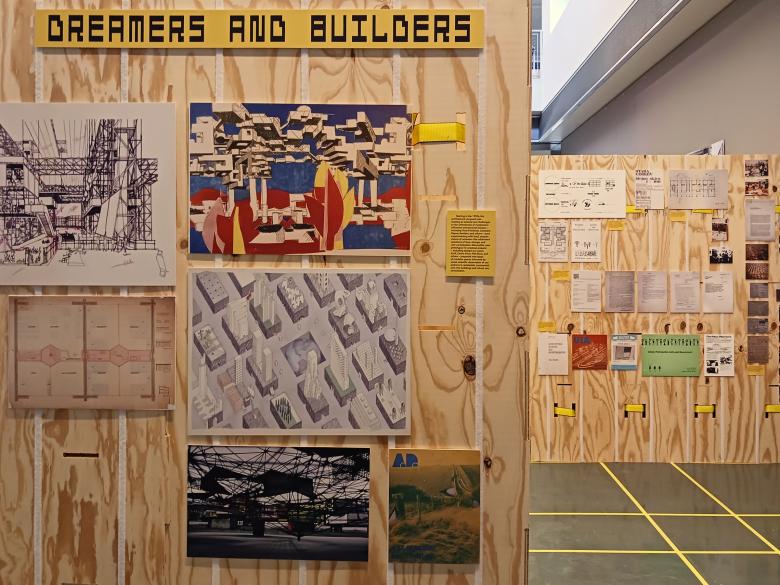 Whereas the 2022 iteration in Eindhoven featured archival drawings and other documents mounted on panels attached to steel studs, the CCNY iteration uses box-like plywood partitions and Velcro.