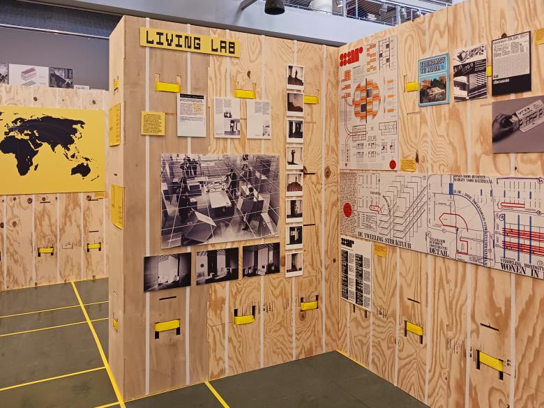 While the majority of the drawings and documents mounted to the plywood pertains directly to SAR, some of it shows work by architects inspired by them or aligned with their tenets of flexibility; seen here, for instance, are The City of the Captive Globe Project by Rem Koolhaas and Madelon Vriesendorp, and drawings by Yona Friedman.