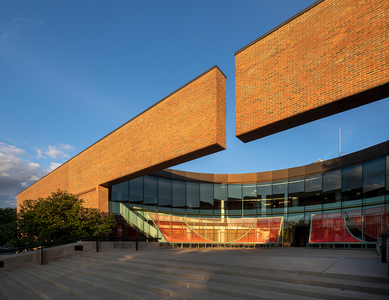 Edward Bassett of Skidmore, Owings & Merrill designed one of Columbus's most distinctive buildings, the Columbus City Hall (1981), which is fronted by a brick wall with cantilevered arms at the curved-glass entrance. Here, New York's Bryony Roberts added Soft Civic, made up of curved structures draped with colorful woven surfaces. Situated at the entrance and on the lawn, the structures invite children to play on them, while also serving to host functions throughout the duration of Exhibit Columbus.