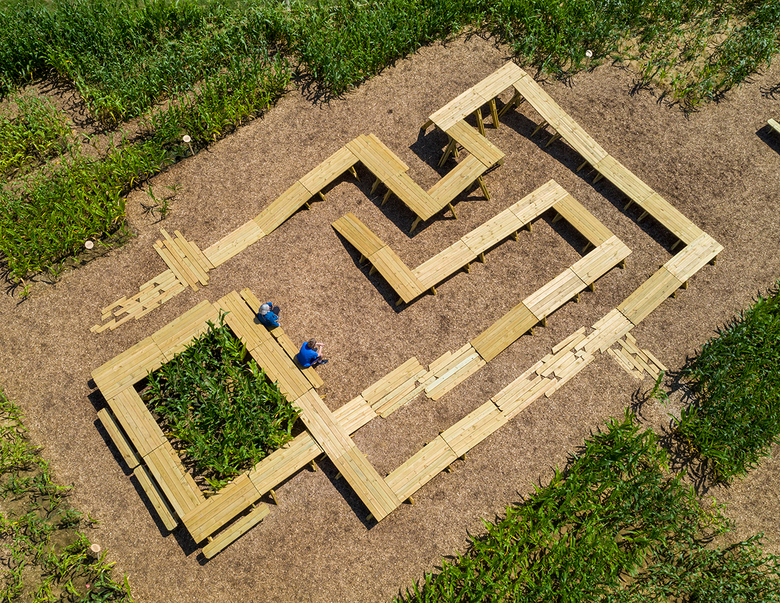 MASS Design Group's contribution takes over some of the lawn of the Central Middle School, designed by Ralph Johnson from Perkins + Will and completed twelve years ago. Accordingly, the firm from Boston and Rwanda designed an edible installation that responds to the disconnection between what we eat and where it's grown. Corn / Meal consists of five types of edible corns (no feed for cattle here) surrounding picnic tables that were playfully arranged like a maze or elevated circuit.