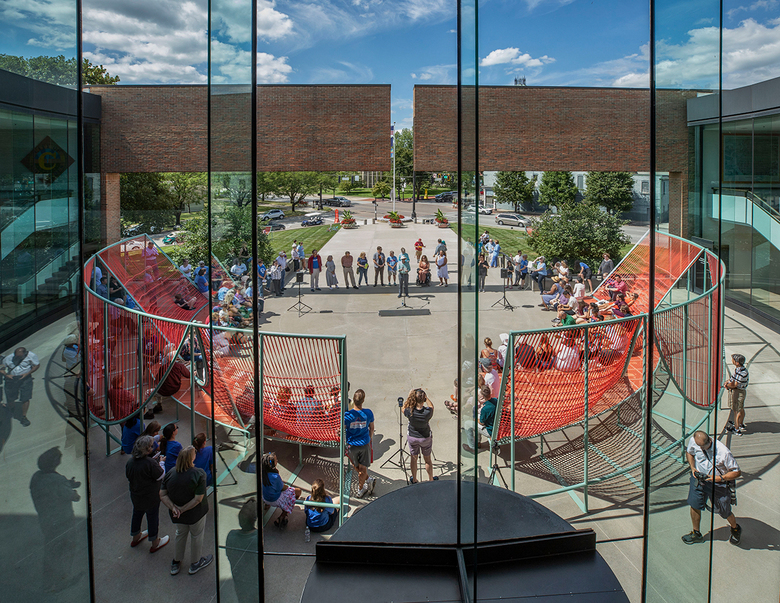 Although Into the Hedge is located on the lawn of the 19th century Bartholomew County Courthouse, Florian Idenburg and Jing Liu of New York's SO-IL were inspired by a modern landmark in Columbus: Dan Kiley's landscape at Eero Saarinen’s Miller House and Garden from 1957. The installation is made up of 130 Arbor Vitae trees planted among a large-scale hammock structure that invites people to traverse the latter's undulating surfaces. The trees, selected in partnership with the Miller House and Garden, will be replanted after Exhibit Columbus in the hedgerows that define that property's perimeter.