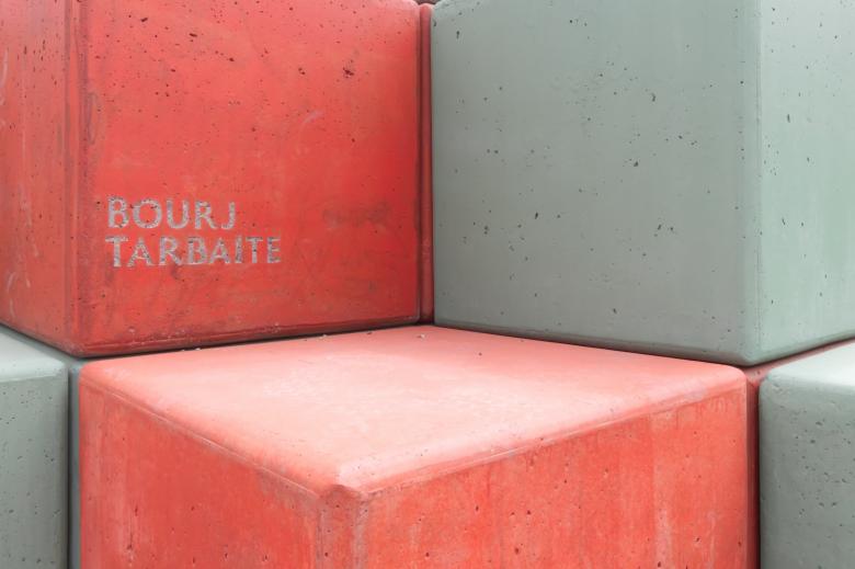 Also subtle is the how the artist's acrobatic inspiration is expressed in words stamped into some of the blocks, each one describing different formations used by acrobats in Morocco: tqal (weight), bourj tarbaite (tower of four), and bourj benayma ou chebaken (tower lift with net).