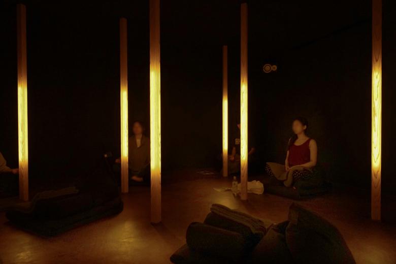 Participants select a pillar of light to focus on and sit next to it on a cushion prepared for them.