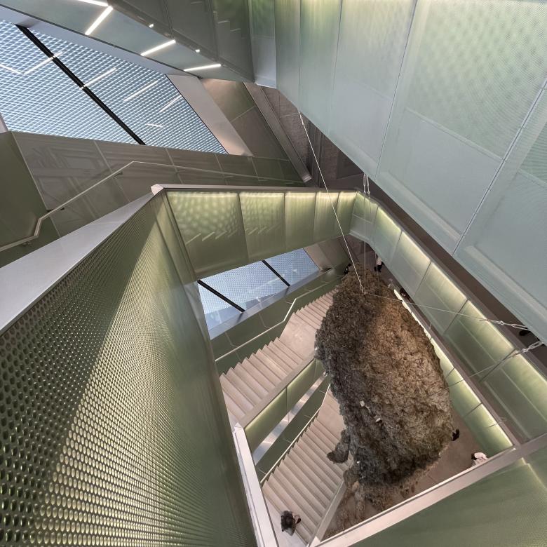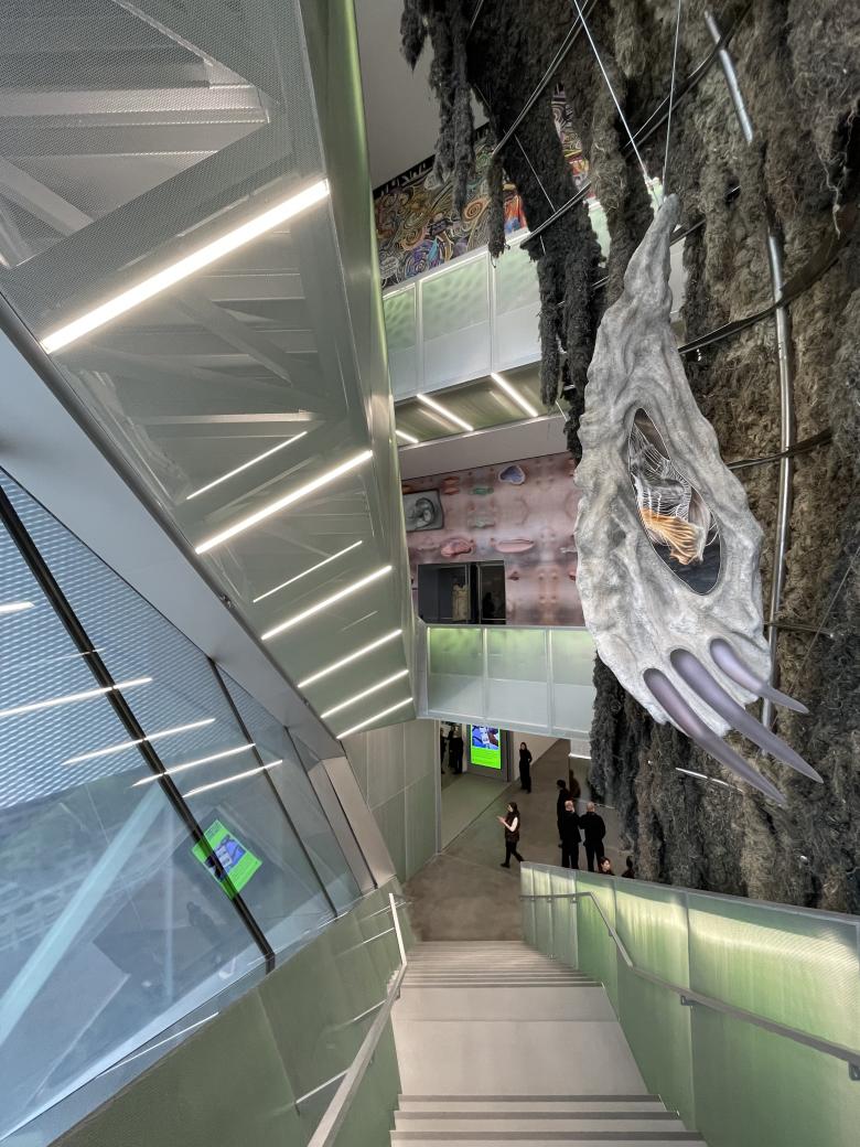 Looking down, other artworks coming into view: Emma Talbot's Cosmos (2025) on the wall of the third floor (top left) and Klára Hosnedlová's large-scale Shelter (2025) that spans three floors. (Photo: John Hill/World-Architects)