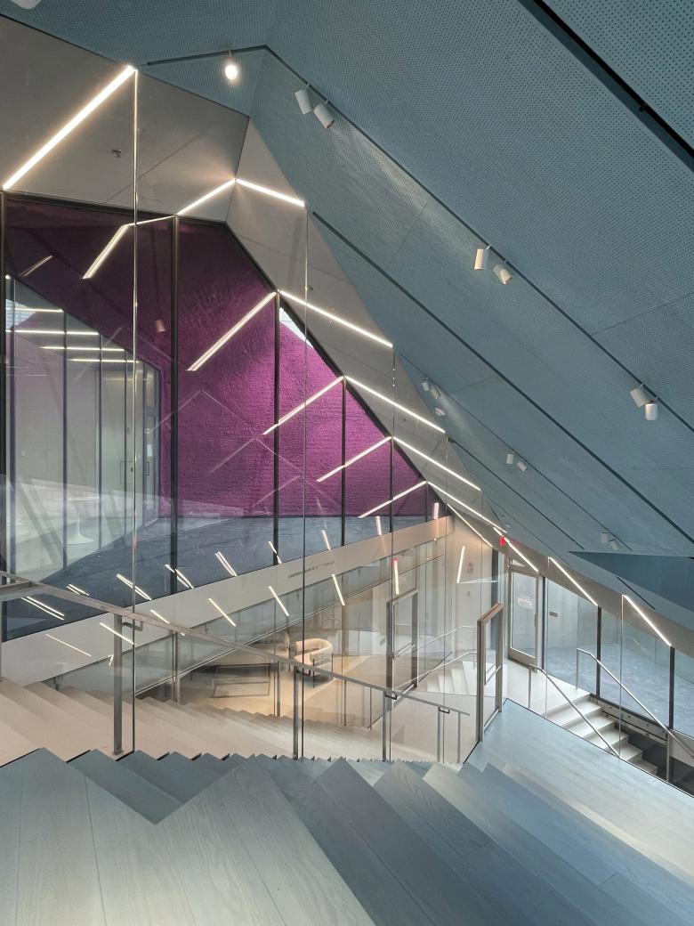 The stairs on the top three floors zig and zag their way through the different program spaces and gain natural light via the triangular terraces. (Photo: John Hill/World-Architects)