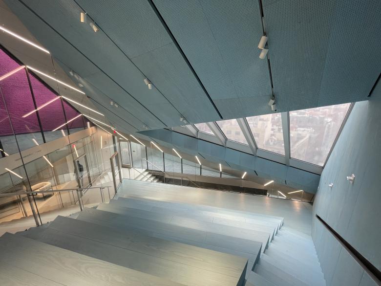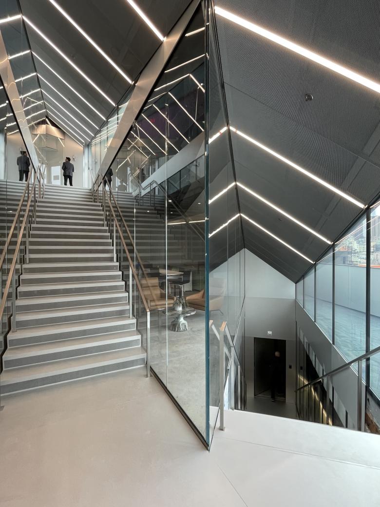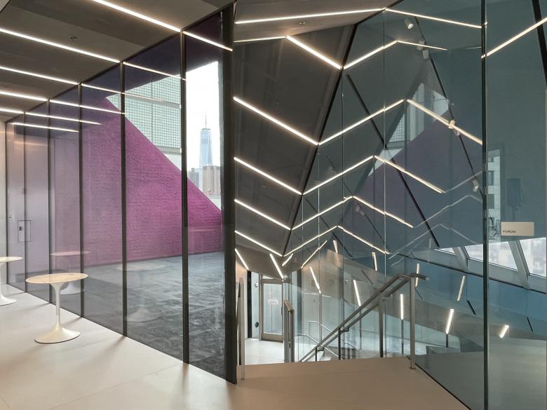 The vertiginousness of the steep Forum space is amplified by the triangular window looking down on the rooftops of buildings in Nolita and Soho. (Photo: John Hill/World-Architects)